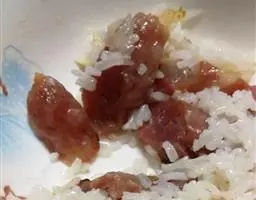 7、米淘洗干净,依次铺上食材腊肠、放生玉米粒。