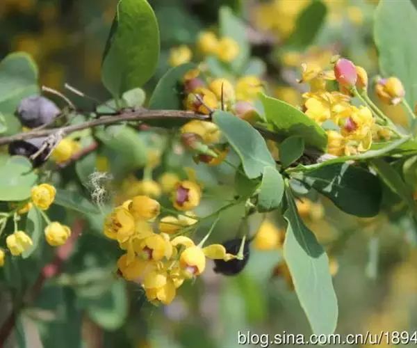 花2-5朵组成具总梗的伞形花序,或近簇生的伞形花序或无总梗而呈簇生状;花梗长5-10毫米,无毛;小苞片卵状披针形,长约2毫米,带红色;花黄色;外萼片卵状椭圆形,长4-4.5毫米,宽2.5-3毫米,先端近钝形,带红色,内萼片阔椭圆形,长5-5.5毫米,宽3.3-3.5毫米,先端钝圆;花瓣长圆状倒卵形,长5.5-6毫米,宽3-4毫米,先端微凹,基部略呈爪状,具2枚近靠的腺体;雄蕊长3-3.5毫米,药隔不延伸,顶端平截;子房含胚珠1-2枚,无珠柄。浆果椭圆形,长约8毫米,直径约4毫米,亮鲜红色,无宿存花柱。种子1-2枚,棕褐色。花期4-6月,果期7-10月。