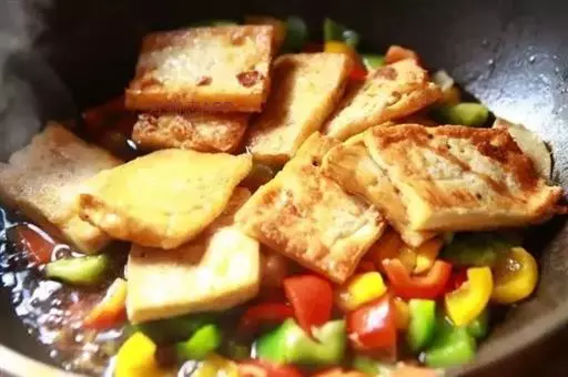 8、煎至底部金黄、千页豆腐鼓起变厚边缘上翘后翻面,煎至两面金黄色盛出即可。