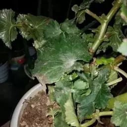 真菌病害,由葡萄孢菌引起的灰霉病症状:秋海棠叶片灰霉病经常发植株的下部,尤其是根茎处与基质接触的地方更容易感染病菌,被水浸润的病斑很快会扩散到整个叶整个植株,受害区域呈现坏死斑点,逐渐由褐色转变为黑色。当夜间温度较低、白天温度较高而且湿高时,病原孢子生长加快,受害的叶片上会长出灰绿色的霉状物。