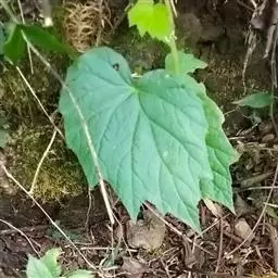 叶均基生,具长柄;叶片两侧极不相等,轮廓卵状圆形或近圆形,长8-10厘米,宽5.5-7.5厘米;先端急尖,基部深心形,窄侧宽约2-3厘米,宽侧宽约4厘米,向下延伸约3厘米,边缘有疏而浅不规则钝锯齿,上面深绿色,下面色淡,被小圆形突起,掌状脉,下面明显呈深紫色,窄侧3条,宽侧5条,近中部呈羽状;叶柄长7.5-9厘米,粗而扁,两侧边呈膜质,无毛;托叶卵形,长7-9毫米,无毛。
