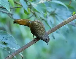 纹喉凤鹛:小型鸟类,体长13-16厘米。头顶和羽冠暗褐色或褐灰色,上体橄榄褐色,飞羽黑褐色,…