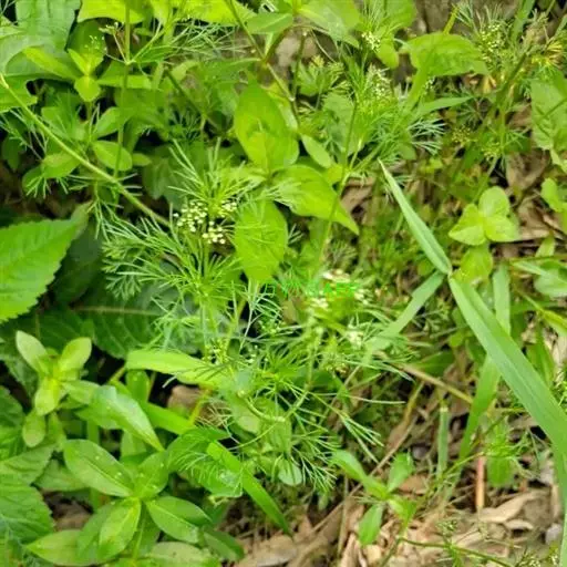 细叶旱芹(学名:Apium leptophyllum (Pers.) F. Muell. ),一年生草本,高25-45厘米。茎多分枝,光滑。根生叶有柄,基部边缘略扩大成膜质叶鞘;叶片轮廓呈长圆形至长圆状卵形,裂片线形至丝状;茎生叶通常三出式羽状多裂,裂片线形,长10-15毫米。复伞形花序顶生或腋生,通常无梗或少有短梗,无总苞片和小总苞片;花柄不等长;无萼齿;花瓣白色、绿白色或略带粉红色,卵圆形;花丝短于花瓣,很少与花瓣同长,花药近圆形,长约0.1毫米;花柱基扁压,花柱极短。果实圆心脏形或圆卵形;胚乳腹面平直,每棱槽内有油管1,合生面油管2。心皮柄顶端2浅裂。花期5月,果期6-7月。