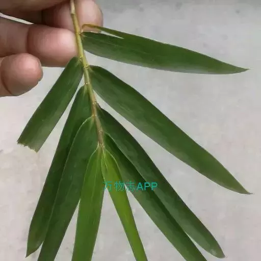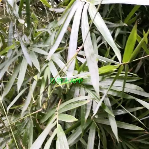 竿箨幼时薄被白蜡粉,早落;箨鞘呈梯形,背面无毛,先端稍向外缘一侧倾斜,呈不对称的拱形;箨耳极微小以至不明显,边缘有少许繸毛;箨舌高1-1.5毫米,边缘呈不规则的短齿裂;箨片直立,易脱落,狭三角形,背面散生暗棕色脱落性小刺毛,腹面粗糙,先端渐尖,基部宽度约与箨鞘先端近相等。末级小枝具5-12叶;叶鞘无毛,纵肋稍隆起,背部具脊;叶耳肾形,边缘具波曲状细长繸毛;叶舌圆拱形,高0.5毫米,边缘微齿裂;叶片线形,长5-16厘米,宽7-16毫米,上表面无毛,下表面粉绿而密被短柔毛,先端渐尖具粗糙细尖头,基部近圆形或宽楔形。