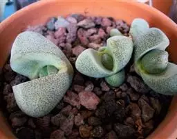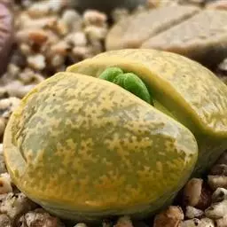 荒玉为番杏科生石花属,原产南非。株体呈白粉色,表面布满凹凸纹路,凹陷处为红褐色,每年秋季开黄花。