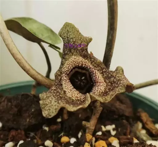 花紫绿色,直径5-6厘米;花梗长约1厘米;花被管浅杯状或半球状,长约1.4厘米,直径约2厘米,喉部稍缢缩,有宽大喉孔,喉孔直径约1.5厘米,膜环不明显,内壁有格状网眼,花被裂片宽卵形,长约2厘米,宽约2.5厘米,基部有半圆形乳突皱褶区;雄蕊药隔伸出,钝圆形;子房近上位,花柱顶端Z裂或稍下凹,柱头卵状,侧生。花期4-5月。