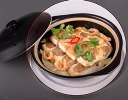豆腐煲是一道美味可口的名肴,属于粤菜系。主料:北豆腐、蟹味菇、瑶柱、鲜茶树菇