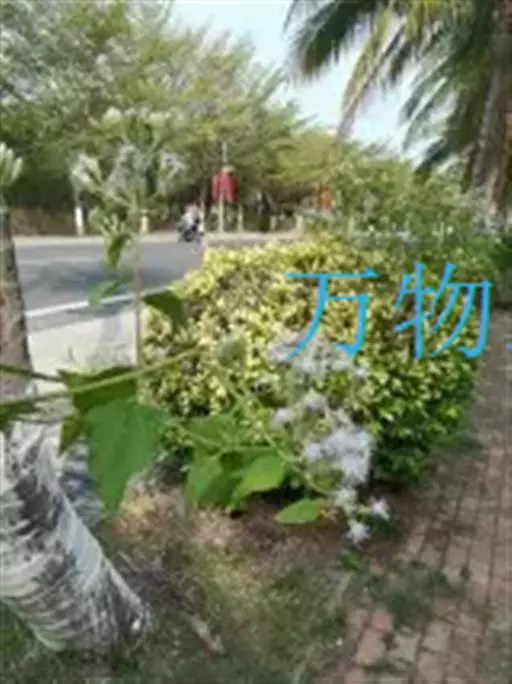 飞机草(学名:Eupatorium odoratum L.):是多年生草本植物,根茎粗壮,横走。茎直立,高1-3米,苍白色,有细条纹;分枝粗壮,常对生,叶对生,卵形、三角形或卵状三角形,花序下部的叶小,常全缘。头状花序多数或少数在茎顶或枝端排成复伞房状或伞房花序,总苞圆柱形,总苞片3-4层,覆瓦状排列,外层苞片卵形,麦杆黄色。花白色或粉红色。瘦果黑褐色,5棱,花果期4-12月。