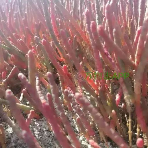 盐角草 一年生草本,高10-35厘米。茎直立,多分枝;枝肉质,苍绿色。叶不发育,鳞片状,长约1.5毫米,顶端锐尖,基部连合成鞘状,边缘膜质。