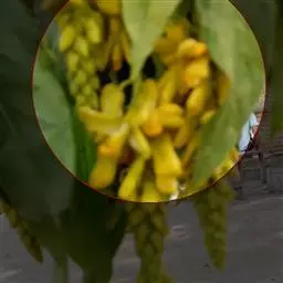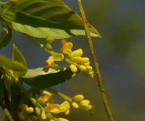 总状花序腋生,花密集,长2厘米,果时延长达6-12厘米,总花梗具纵棱;花小,具小苞片,早落;萼片5,外面3片卵形或三角状卵形,长约1.5毫米,宽1毫米,里面2片花瓣状,长圆形,长约3毫米,宽约2毫米,先端圆形,基部具爪;花瓣3,黄色,侧瓣长圆形,较龙骨瓣稍长,龙骨瓣具2薄片、先端浅裂或不裂的鸡冠状附属物;雄蕊8,花丝3/4以下合生成鞘,花药卵形;子房倒卵形,径约1毫米,花柱由下向上逐渐加宽,并弯曲,呈喇叭状,柱头生于其内。