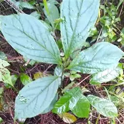 叶片纸质,卵形,长2-4(-5)厘米,宽1-2.5厘米,先端渐尖,具骨质短尖头,基部楔形下延,边缘具缘毛,叶面绿色,疏被白色短硬毛,背面淡绿色,无毛,主脉两面隆起,侧脉明显,于边缘处网结,且成1与叶缘平行的两面突起的纵脉;叶柄长5-10毫米。