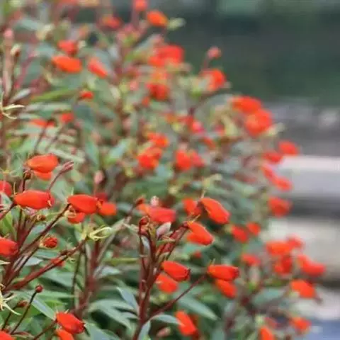 花单生叶腋或呈小簇生于叶腋间,小玲珑可爱,瓣5,橙红色或其它花色,花梗细长亮红色。