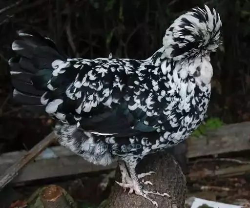 贵妇鸡形态奇特,体型娇小玲珑。冠为羽毛凤冠,成年雄鸡更明显。冠体前有一独立的呈锥形小冠体,冠体为豆冠,冠体两侧为碗状发达的肉质体,延伸为“V”形肉质角状冠,色泽鲜红、细致,后侧形如圆球状的大朵黑白花片羽毛束,好似西洋贵妇人的帽子,因而得名贵妇鸡。