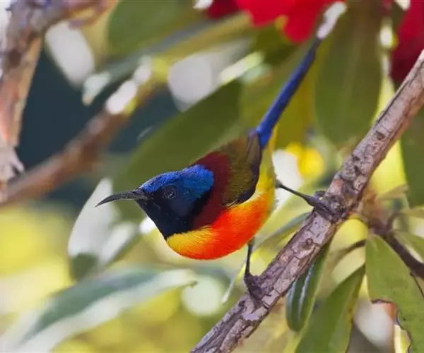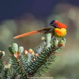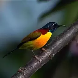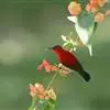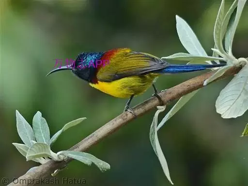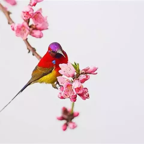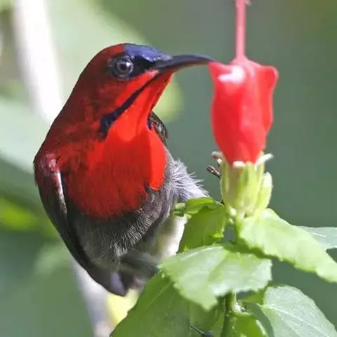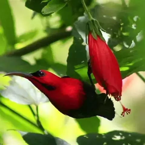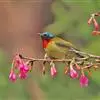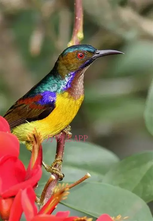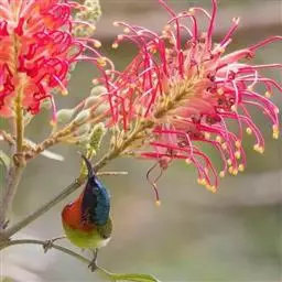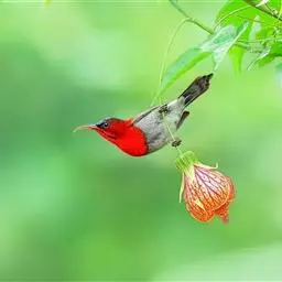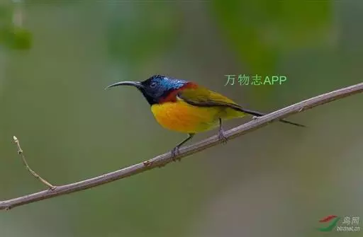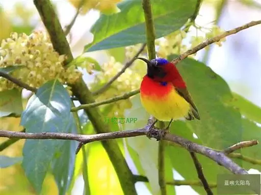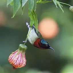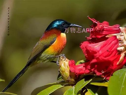绿喉太阳鸟(学名:Aethopyga nipalensis):共有9个亚种。小型鸟类,雄鸟体长13-15厘米、雌鸟10-12厘米。雄鸟前额至后颈、颏和喉辉绿色,头侧黑色,颈侧和背暗红色,两肩、下背橄榄绿色,腰鲜黄色,尾上覆羽和中央尾羽暗绿色,中央尾羽延长。胸黄色而杂有细的红色纵纹,其余下体黄绿色。雌鸟上体橄榄绿色、颏、喉淡灰绿色,其余下体淡黄色。