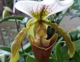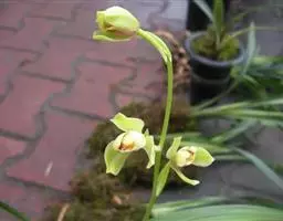 假鳞茎长圆状卵球形至近方形,长达2厘米,宽1厘米。叶1枚,生于假鳞茎顶端,披针形,长可达30厘米,宽约1.7厘米,具明显的脉;叶柄长达10厘米。花葶从假鳞茎侧面发出,长达35厘米,中下部有2枚筒状鞘;总状花序具约20朵花;花苞片披针形,长约5毫米;花梗和子房长约1.2厘米;花大,张开,直径达1.5厘米,棕绿色或黄绿色,但唇瓣淡粉红色至白色并有紫色斑点;中萼片线状披针形,长1.5-1.6厘米,宽约3毫米,先端近急尖;侧萼片宽披针形,长约12毫米,宽3毫米;花瓣长圆状披针形,长约13毫米,宽约3毫米,先端钝;唇瓣长达11.6毫米,3裂,基部有长爪;侧裂片长圆形,长约4.2毫米,宽1.2毫米,稍内弯,先端钝;中裂片卵状椭圆形,长为唇瓣的3/5,宽约6毫米,边缘波状;唇盘上有2条半月形的纵褶片,位于两枚侧裂片之间和中裂片基部上方,长达2.6毫米,高约1毫米;蕊柱长达8.3毫米。花期5-6月。