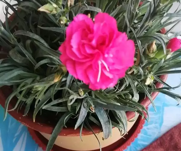 盆栽康乃馨,应选内径较大的高筒盆,盆底先施足含钾、钙、氮、磷的基肥。移植后,晴天每天浇水一次,保持盆土潮润。因为康乃馨既怕水涝,也不耐干旱。