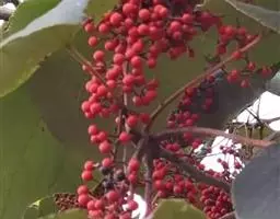 浆果黑色,球形,顶端有宿存花柱,直径4-5毫米;种子2-3粒,卵形,长2-3毫米,鲜时绿色,干后褐色,有黑色条纹。花期春季,果期冬季。