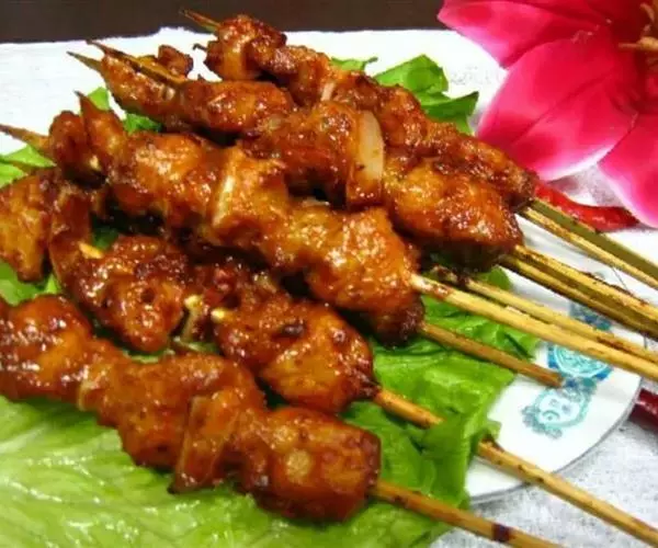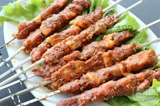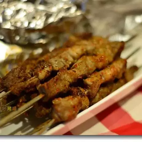 1.羊肉切成小块(每块10克,即约切成25块),用胡椒粉、盐、醋、洋葱末腌2小时,然后穿在短竹扦上,共穿5串;