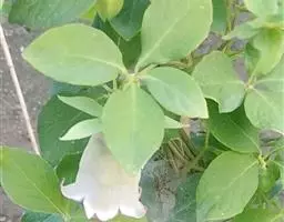 花单生于枝端,与叶柄互生或近于对生,有梗。花萼贴生至子房中部,筒部半球状,裂片宽披针形或狭矩圆形,长1-2厘米,宽约6-8毫米,顶端钝或微尖,微波状或近于全缘,其间湾缺尖狭;花冠上位,阔钟状,长约1.8-2.3厘米,直径1.8-2.5厘米,黄绿色,内面有明显紫斑,浅裂,裂片正三角形,端尖,全缘;花丝基部微扩大,长约5毫米,花药长形,长5-6毫米;柱头有白色刺毛。蒴果下部半球状,上部短圆锥状。种子多数,卵形,无翼,细小,棕黄色,光滑无毛。花果期7-10月。