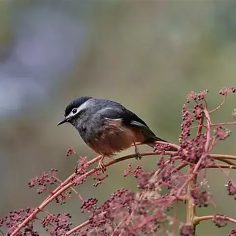 栗耳凤鹛,雌雄羽色相似。额、头顶至枕灰色,头顶有一短的不甚明显的羽冠,…