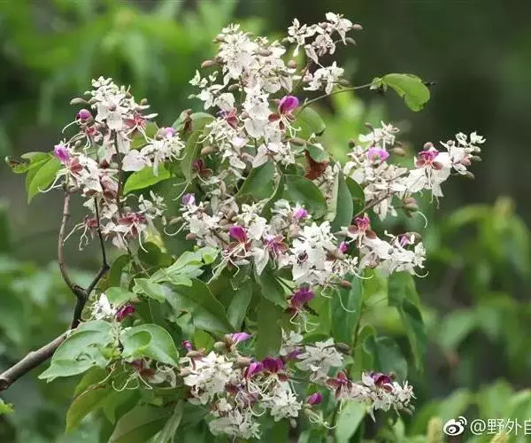 圆锥花序长13-20厘米,披散,苞片和小苞片白色,阔卵形、卵状长圆形或长圆形,苞片长1.5-3.1厘米,小苞片长0.5-1.5厘米;萼管较短,长5-9毫米,裂片长圆形至阔长圆形,比萼管长;花瓣倒卵形,连柄长1.6-1.9厘米,先端近截平而微凹,紫色;能育雄蕊的花药长3-4毫米,药室边缘紫红色;退化雄蕊8枚或5-6枚,不等长;子房沿二缝线被长柔毛,有胚珠9-14颗。