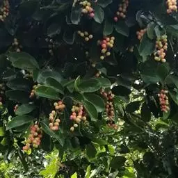 核果近圆球形,直径4-7毫米,2室;种子褐红色,长卵形,长3.5-4毫米,宽约3毫米,腹面压扁状,有纵槽,背面稍凸起,有纵条纹。花果期几乎全年。