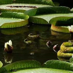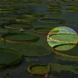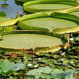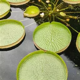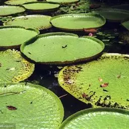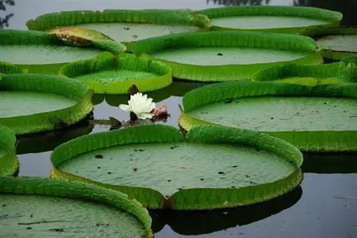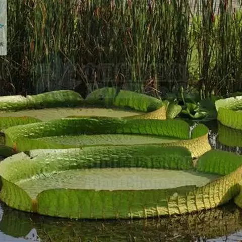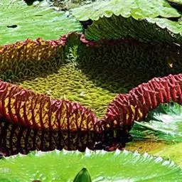 属睡莲科多年生或一年生大型浮叶草本。有直立的根状短茎和发达的不定须根,白色。果实成熟时,内含五六百粒种子,大小形状似豌豆,含有丰富淀粉,可食用,南美洲人因此称之为“水玉米”。王莲是水生有花植物中叶片最大的植物,其初生叶呈针状,长到2~3片叶呈矛状,至4~5片叶时呈戟形,长出6~10片叶时呈椭圆形至圆形,到11片叶后叶缘上翘呈盘状,叶缘直立,叶片圆形,像圆盘浮在水面,直径可达2米以上,叶面光滑,绿色略带微红,有皱褶,背面紫红色,叶柄绿色,长2~4m,叶子背面和叶柄有许多坚硬的剌,叶脉为放射网状。