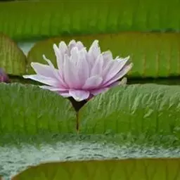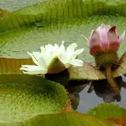 王莲是水景园中的瑰宝,口十片为圆形,叶片边缘向上卷曲,整个叶面浮于水面,十分奇特。王莲的单花花期仅三天,每天的颜色还不相同,开花时花蕾伸出水面,第一天开白色并伴有芳香,第二天变为粉红色,第三天则变为紫红色,然后闭合沉入水中,种子在水中成熟。   王莲主要有‘克鲁兹’王莲和‘亚马逊’王莲2个栽培种,‘克鲁兹’王莲的耐寒性、抗逆性较‘亚马逊’王莲强,栽培也较为容易,北方地区多引种 和栽培此种。‘克鲁兹’王莲叶片直径1.5m~1.8m,边缘直立可达10cm~15cm,叶背叶脉呈深红色,一般于8月中旬至9月开花。