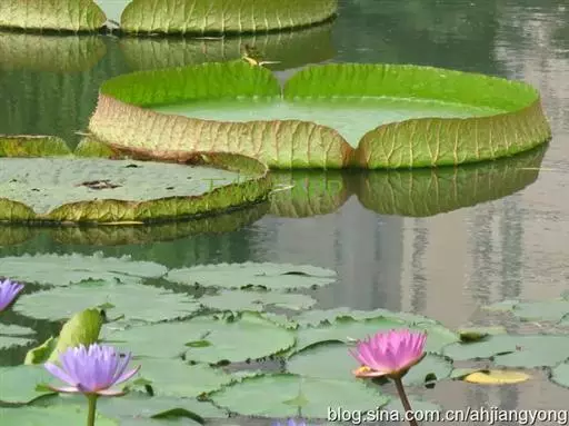 王莲是水景园中的瑰宝,口十片为圆形,叶片边缘向上卷曲,整个叶面浮于水面,十分奇特。王莲的单花花期仅三天,每天的颜色还不相同,开花时花蕾伸出水面,第一天开白色并伴有芳香,第二天变为粉红色,第三天则变为紫红色,然后闭合沉入水中,种子在水中成熟。 王莲主要有‘克鲁兹’王莲和‘亚马逊’王莲2个栽培种,‘克鲁兹’王莲的耐寒性、抗逆性较‘亚马逊’王莲强,栽培也较为容易,北方地区多引种 和栽培此种。‘克鲁兹’王莲叶片直径1.5m~1.8m,边缘直立可达10cm~15cm,叶背叶脉呈深红色,一般于8月中旬至9月开花。