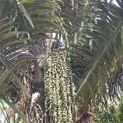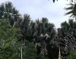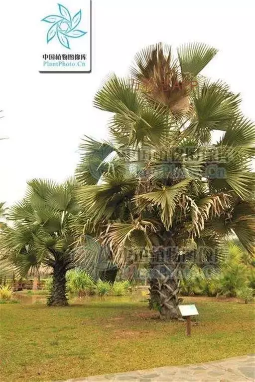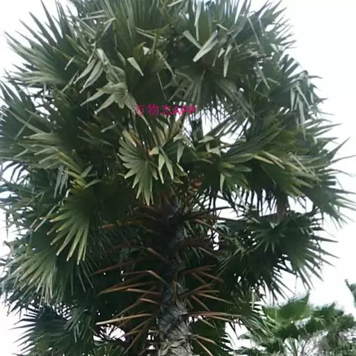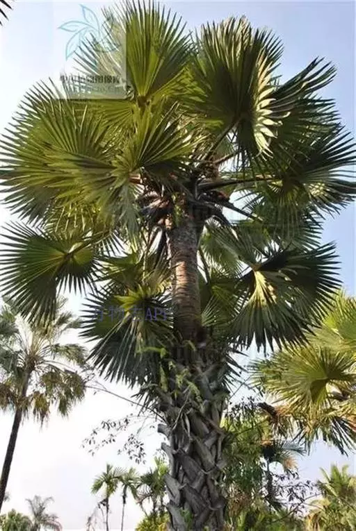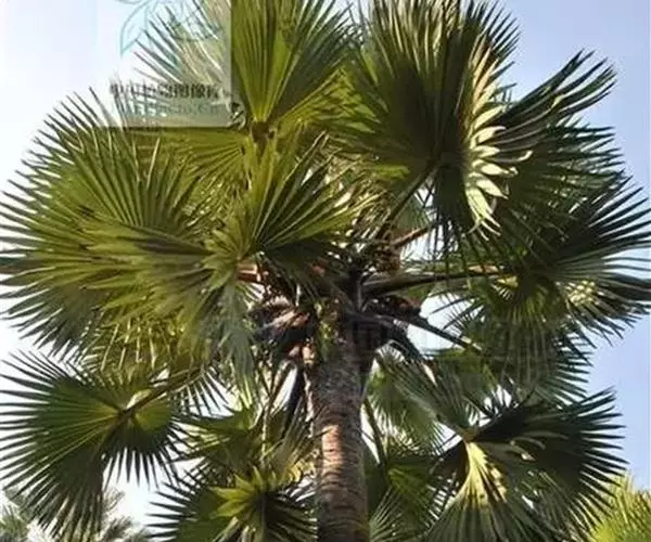 糖棕(学名:Borassus flabellifer L.)是棕榈科,糖棕属植株粗壮高大,乔木状植物。高可达33米,直径最粗可达90厘米。叶大型,掌状分裂,近圆形,有裂片,裂至中部,线状披针形,渐尖,先端2裂;叶柄粗壮,雄花序可长达1.5米,每分枝掌状分裂小穗轴,小穗轴略圆柱状,雄花小,黄色,着生于小穗轴上小苞片的凹穴里,萼片下部合生,花瓣较短,匙形,花药大,长圆形;雌花序长约80厘米,花较大,球形,螺旋状排列,果实大,近球形,压扁,外果皮光滑,黑褐色,中果皮纤维质,内果皮包着种子。种子胚乳角质,均匀。