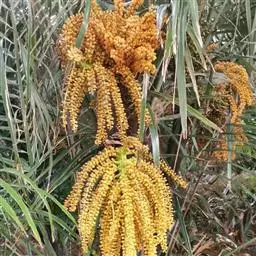 雄花序可长达1.5米,具3-5个分枝,长约35厘米或更长,每分枝掌状分裂为1-3个小穗轴,小穗轴略圆柱状,顶端稍狭,长约25厘米;雄花小,多数,黄色,着生于小穗轴上小苞片的凹穴里,萼片3,下部合生,花瓣较短,匙形,雄蕊6,花丝与花冠合生成梗状,花药大,长圆形;雌花序长约80厘米,约有4个分枝,长30-50厘米,粗壮,小穗轴长20-25厘米,雌花较大,球形,直径约2.5厘米,每小穗轴约有8-16朵花,螺旋状排列,退化雄蕊6-9。果实大,近球形,压扁,直径10-15 (-20)厘米,外果皮光滑,黑褐色,中果皮纤维质,内果皮由3(-l)个硬的分果核组成,包着种子。种子通常3颗,胚乳角质,均匀,中央有1空腔,胚近顶生。