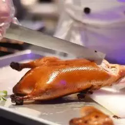 3、将芒果摆在盘中,拼盘出造型后,浇上调好的沙拉汁,旁边可点缀食品雕刻花即可上桌食用。