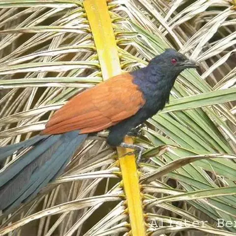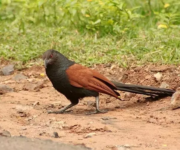 褐翅鸦鹃虹膜赤红色(成鸟)或灰蓝至暗褐色(幼),嘴、脚黑色。