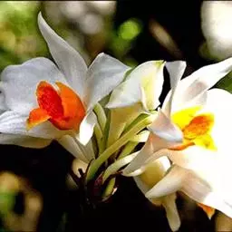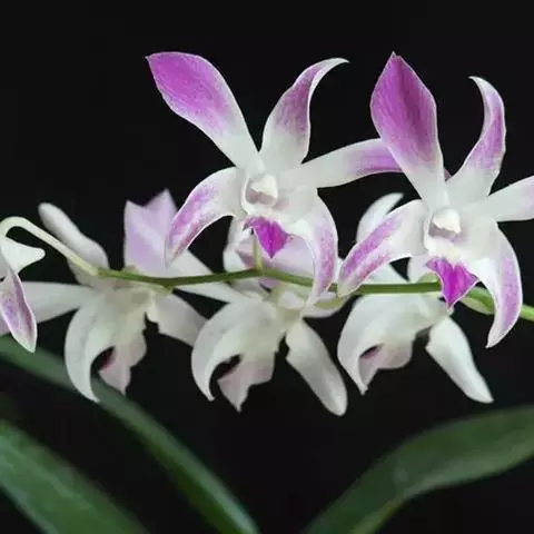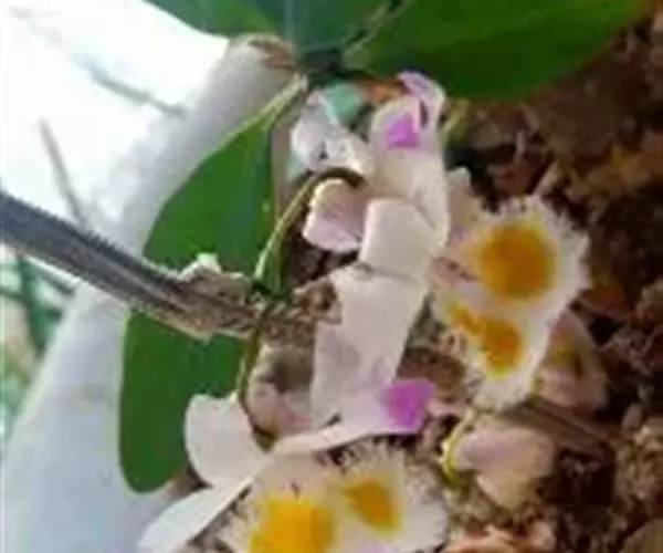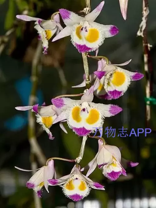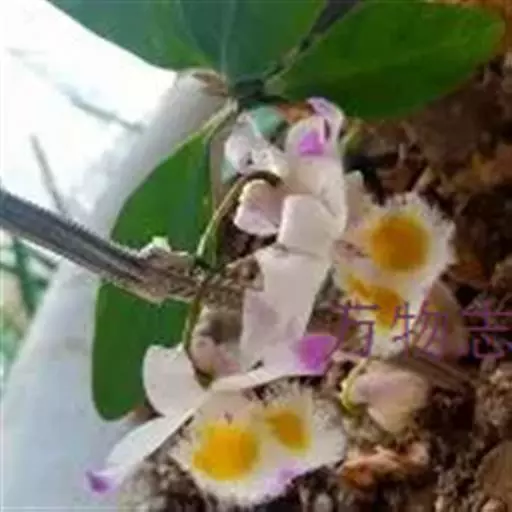 齿瓣石斛(学名:Dendrobium devonianum Paxt.):茎下垂,稍肉质,细圆柱形不分枝,具多数节。叶纸质,二列互生于整个茎上,狭卵状披针形。总状花序常数个,出自于落了叶的老茎上,每个具1-2朵花;花质地薄,开展,具香气;花瓣与萼片同色,卵形,长2.6厘米,宽1.3厘米,先端近急尖,基部收狭为短爪,边缘具短流苏,具3条脉,其两侧的主脉多分枝;唇瓣白色,前部紫红色,中部以下两侧具紫红色条纹,近圆形,长3厘米。花期4-5月。