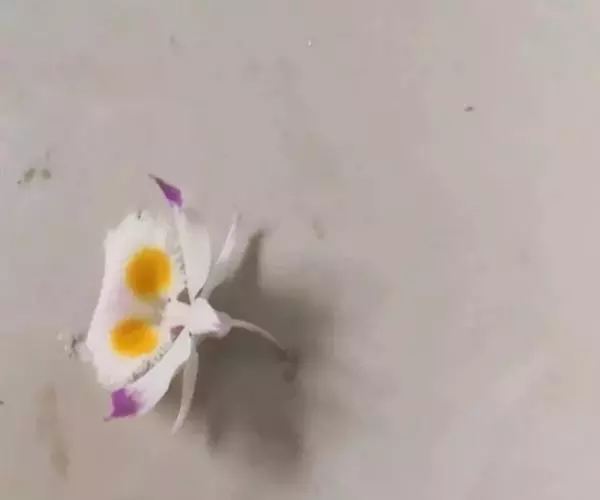 花瓣与萼片同色,卵形,长2.6厘米,宽1.3厘米,先端近急尖,基部收狭为短爪,边缘具短流苏,具3条脉,其两侧的主脉多分枝;唇瓣白色,前部紫红色,中部以下两侧具紫红色条纹,近圆形,长3厘米,基部收狭为短爪,边缘具复式流苏,上面密布短毛;唇盘两侧各具1个黄色斑块;蕊柱白色,长约3毫米,前面两侧具紫红色条纹;药帽白色,近圆锥形,顶端稍凹的,密布细乳突,前端边缘具不整齐的齿。花期4-5月。
