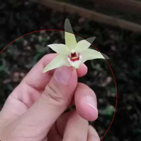 总状花序常数个,出自于落了叶的老茎上,每个具1-2朵花;花序柄绿色,长约4毫米,基部具2-3枚干膜质的鞘;花苞片膜质,卵形,长约4毫米,先端近锐尖;花梗和子房绿色带褐色,长2-2.5厘米;花质地薄,开展,具香气;中萼片白色,上部具紫红色晕,卵状披针形,长约2.5厘米,宽9毫米,先端急尖,具5条紫色的脉;侧萼片与中萼片同色,相似而等大,但基部稍歪斜;萼囊近球形,长约4毫米。