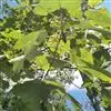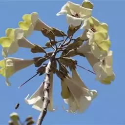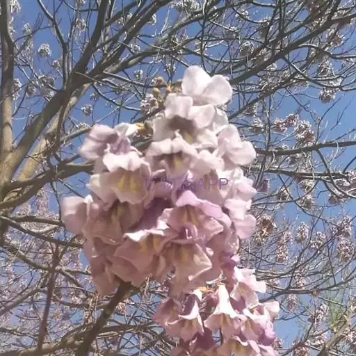 1.泡桐,乔木,高达30m。树皮灰褐色,幼枝、叶、叶柄、花序各部及幼果均被黄褐色星状绒毛。叶柄长达12cm;叶片长卵状心脏形,长可达20cm,先端长渐尖或锐尖头,基部心形,全缘。花序狭长几成圆柱形,长约25cm;小聚伞花序有花3-8朵,头年秋天生花蕾,先叶开放;总花梗与花梗近等长;花萼倒圆锥形,长2-2.5cm,5裂达1-3,裂片卵形,果期变为狭三角形;花冠管状漏斗形,白色,内有紫斑,长达10cm,筒直而向上逐渐扩大,上唇较狭,2裂,反卷,下唇3裂,先端均有齿痕状齿或凹头;雄蕊4,二强,隐藏于花冠筒内;子房2室,花柱细长,内弯。蒴果木质,长圆形,长6-10cm,室背2裂。种子多数,扁而有翅。花期2-3月,果期8-9月。