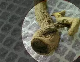 药材性状:多皱缩破碎,只有花冠,花萼则少见。花冠管状,长约4cm,棕色或暗棕色,上部膨大,色较浅,下部弯曲,色深而有皱纹。花萼钟形,革质;先端5裂,裂片三角形。完整的花,用水浸软摊开,花冠呈漏斗状,先端5裂,基部弯曲,内有紫黑色斑点。雄蕊着生于花冠上,4枚,2强,花药“个”字着生。子房上位,花柱细长。气微弱,味淡。以身干、花完整、无杂质者为佳。