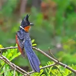 红翅凤头鹃:体长约38厘米,顶冠及凤头黑色,具显眼的直立凤头,背及尾黑色而带蓝色光泽,翅栗红色,…