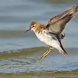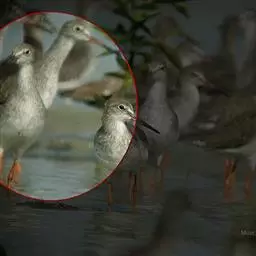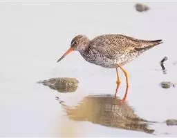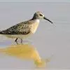 红脚鹬:体长28厘米,上体褐灰,下体白色,胸具褐色纵纹。飞行时腰部白色明显,次级飞羽具明显白色外缘。…