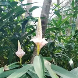 密苞山姜是姜科,山姜属多年生草本植物,株高可达1.5米。叶片椭圆状披针形,顶端渐尖,并具细尾尖,基…