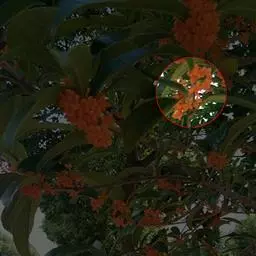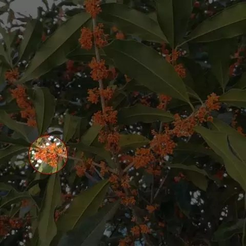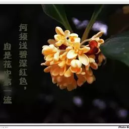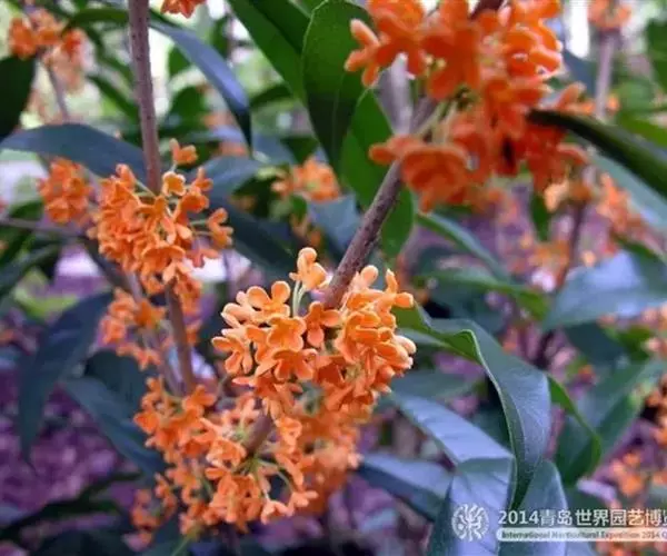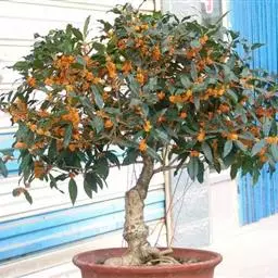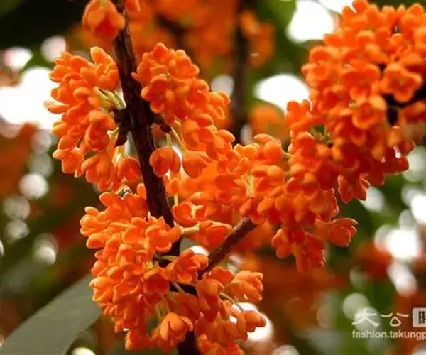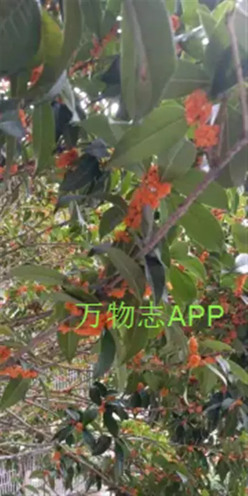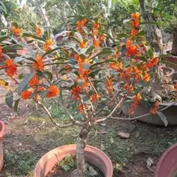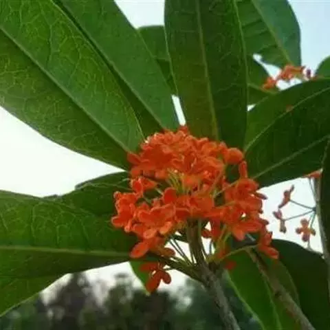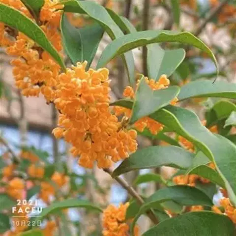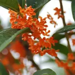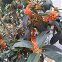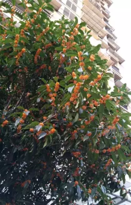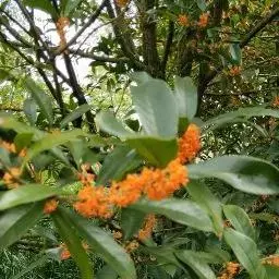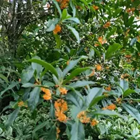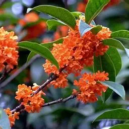 丹桂,又名:木犀、桂花;拉丁文名:Osmanthus fragrans (Thunb.) Lour. 捩花目、木犀科、木犀属常绿乔木,雌雄异株,叶长椭圆形,开橘红色花,香味很浓,树冠圆球形,枝条峭立,紧密度中等。树皮浅灰色,皮孔圆或椭圆形,数量中等,是珍贵的观赏植物。