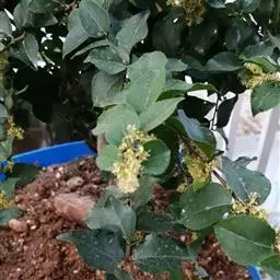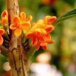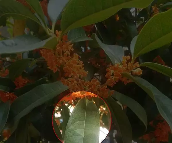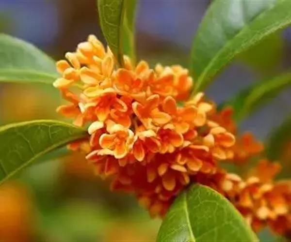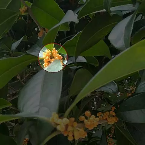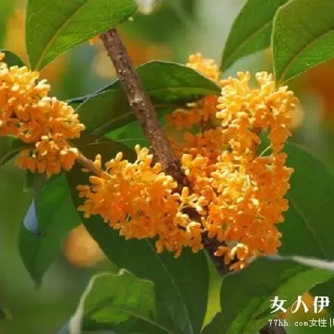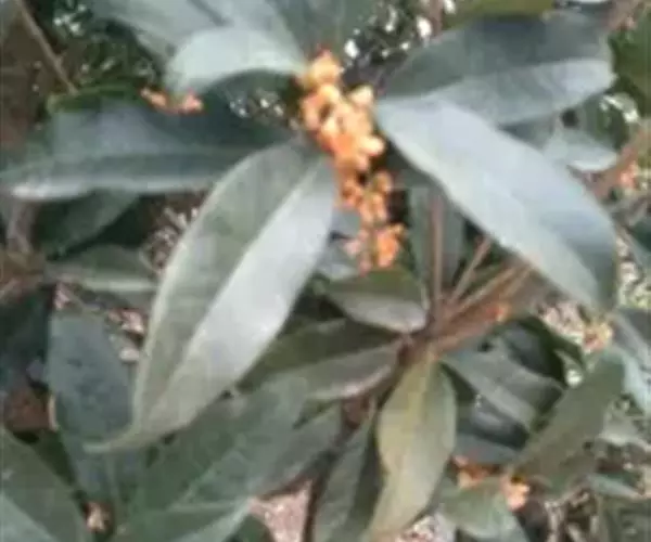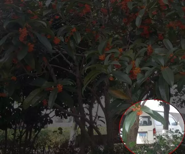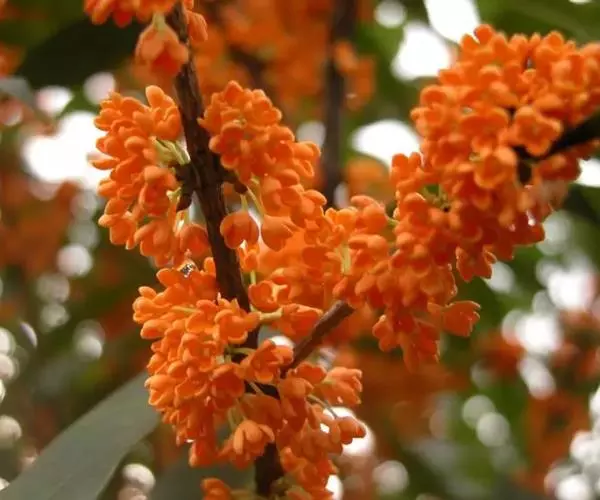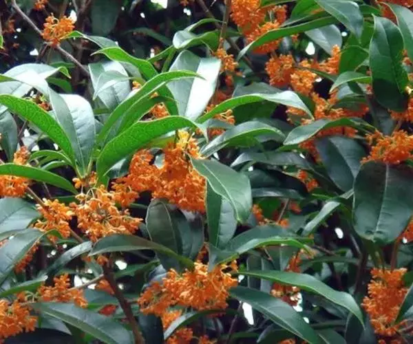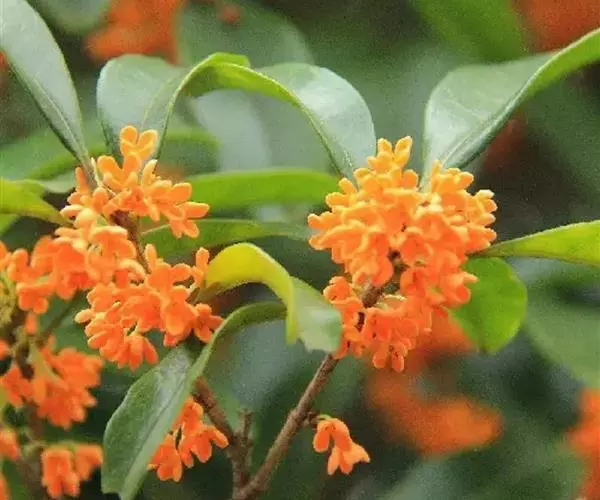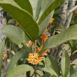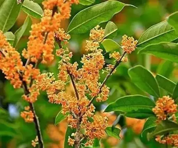 聚伞花序簇生于叶腋,或近于帚状,每腋内有花多朵;苞片宽卵形,质厚,长2-4毫米,具小尖头,无毛;花梗细弱,长4-10毫米,无毛;花极芳香;花萼长约1毫米,裂片稍不整齐;花冠黄白色、淡黄色、黄色或桔红色,长3-4毫米,花冠管仅长0.5-1毫米;雄蕊着生于花冠管中部,花丝极短,长约0.5毫米,花药长约1毫米,药隔在花药先端稍延伸呈不明显的小尖头;雌蕊长约1.5毫米,花柱长约0.5毫米。果歪斜,椭圆形,长1-1.5厘米,呈紫黑色。花期9-10月上旬,果期翌年3月。
