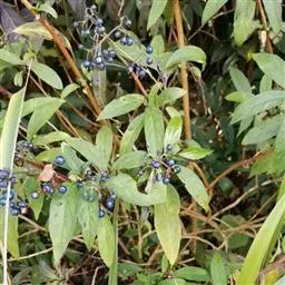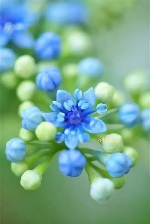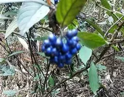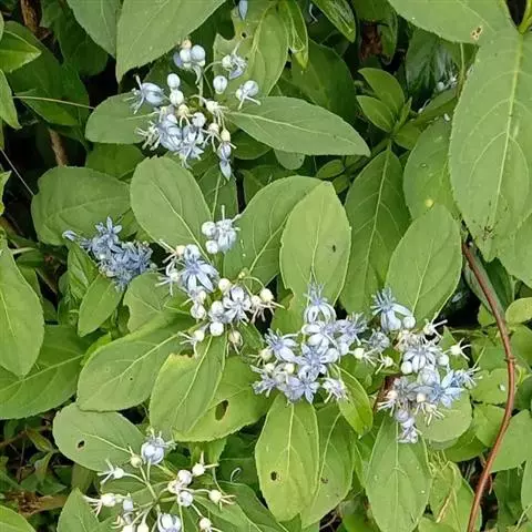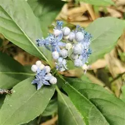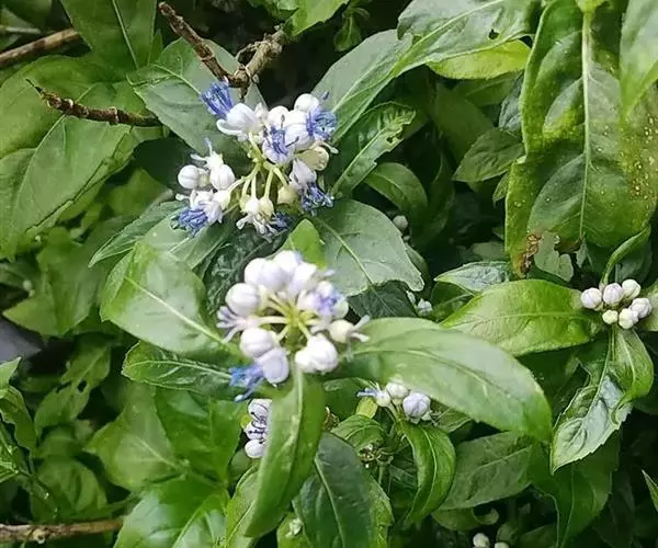 伞房状圆锥花序顶生,有时叶腋有侧生花序,直径3-20厘米,花蓝色或白色;花蕾倒卵形,盛开时直径6-10毫米;花梗长3-5毫米;花萼倒圆锥形,4-6裂;裂片阔三角形,急尖,无毛或被毛;花瓣长圆状椭圆形,稍肉质,花后反折;雄蕊10-20枚,一半与花瓣对生,花丝线形,扁平,初与花瓣合生,后分离,花药椭圆形;花柱4(5-6),棒状,柱头长圆形,子房3/4下位。浆果直径3-7毫米,蓝色,干时黑色;种子长约1毫米,具网纹。花期2-4月,果期5-8月。