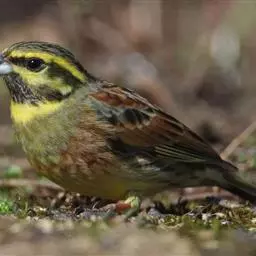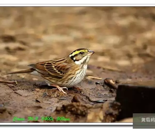 黄眉鹀(学名:Emberiza chrysophrys):体重15-24.0克,体长130-166毫米。属小型鸣禽。头顶和头侧黑色,头顶中央有一白色中央冠纹,前段较窄,到中央变宽。背棕色或红褐色,具宽的黑色中央纹,腰和尾上覆羽棕红色或栗色,两翅和尾黑褐色。下体白色,喉具小的黑褐色条纹,胸和两胁具暗色条纹。雄鸟头部黑色具条纹,有显著的鲜黄色眉纹。下体更白而多纵纹,翼斑也更白,腰更显斑驳且尾色较重。黄眉鹀的黑色下颊纹比白眉鹀明显,并分散而融入胸部纵纹中。与冬季灰头鹀的区别在腰棕色,头部多条纹且反差明显。虹膜暗褐;上嘴褐色,下嘴灰白;脚肉褐色。