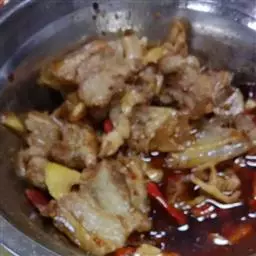 1、牛蛙宰杀去头去皮去内脏洗净,斩成块,用盐、胡椒粉、干豆粉、料酒上浆码味。泡红辣椒去蒂去籽切成节,大葱洗净切成节,泡姜切成姜米!