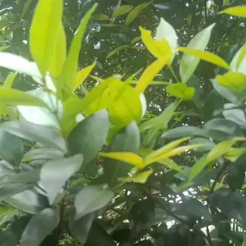 乔木,高20米;嫩枝稍压扁,干后绿色。叶片狭长椭圆形至椭圆形,长14-30厘米,宽6-13厘米,先端渐尖,基部圆形,有时微心形,上面干后绿色,无光泽,下面浅绿色,无明显腺点,侧脉15-22对,平缓斜行,离边缘4-5毫米处互相结合成边脉,靠近边缘1.5毫米处另有1条不明显的边脉,侧脉间相隔1-1.3厘米,有明显网脉;叶柄长5-10毫米。