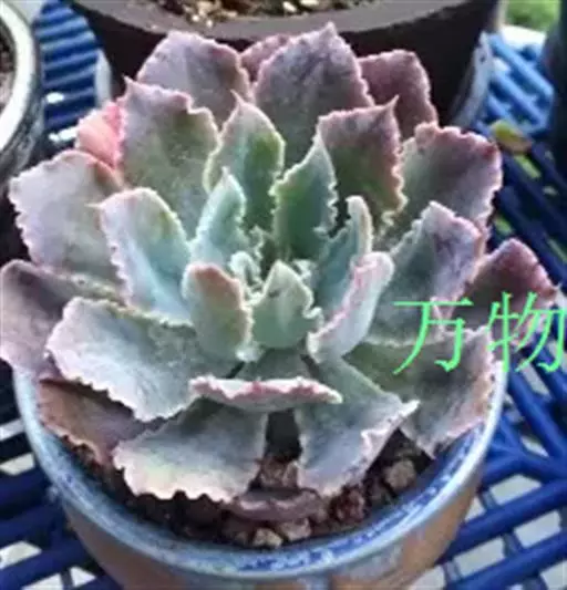 叶:倒卵形-匙形,有短尖;叶缘粉色,呈细褶状;3-5cm长,1.5-2.5cm宽,薄;浅绿色或粉色,被白霜。
