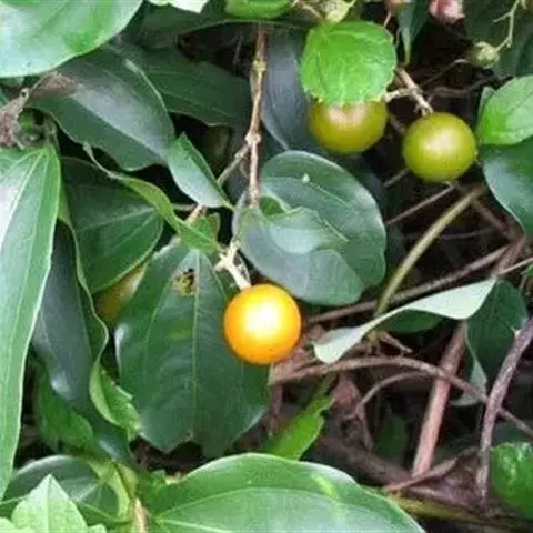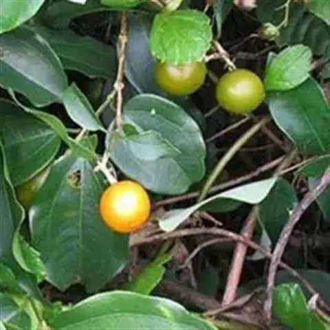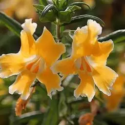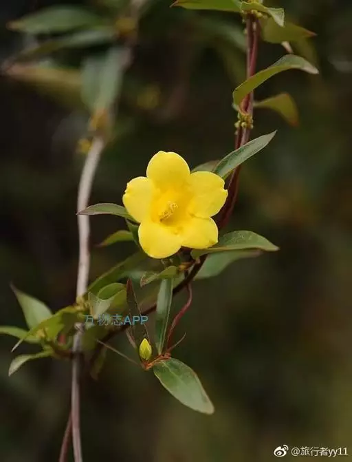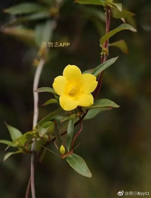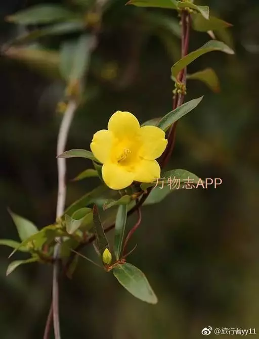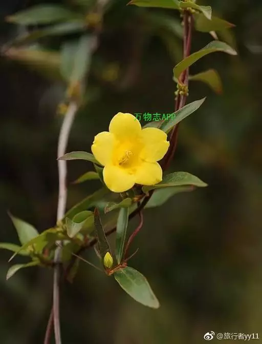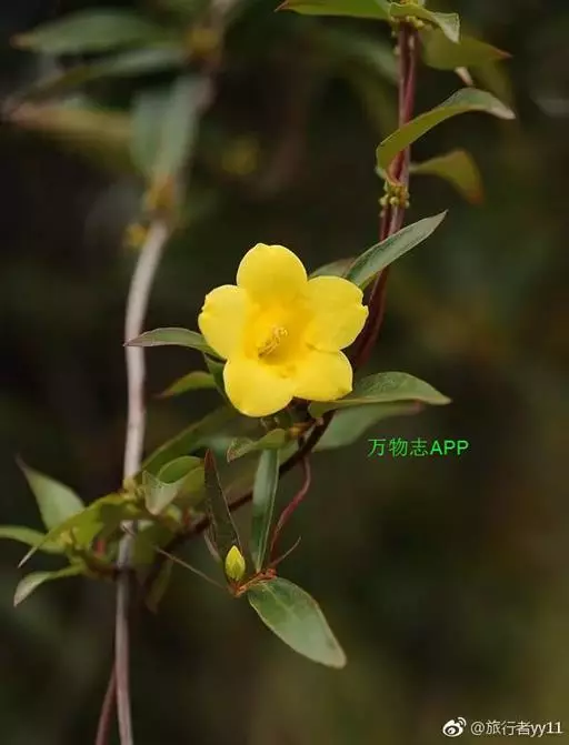 常绿钩吻藤 攀援性灌木,常绿。叶对生,披针形,长6厘米,表面有光泽,先端尖,全缘或疏生波纹,背面稍淡;花单生或成小型聚伞花序,出自叶腋,花漏斗形,五裂,裂片圆形,先端稍凹,鲜黄色有香气,长4厘米,雄蕊5,萼绿色有钝裂,着生于有鳞片的短花梗上,花期3月下旬至5月初。果实为长2厘米的蒴果,2果瓣;种子有膜翅。