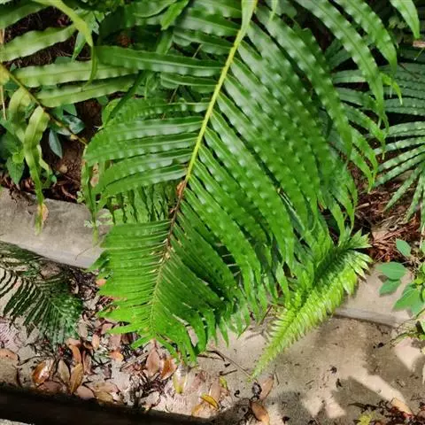植株高18-60厘米。根状茎直立,粗短,或长而斜生,密被鳞片;鳞片披针形,长约6毫米,先端纤维状,边缘全缘或偶有少数小齿牙,棕色或中部为深褐色,有光泽,厚膜质。叶簇生,二形;柄长3-24厘米,粗1-2毫米,禾秆色,基部密被与根状茎上同样的鳞片,向上渐变光滑;叶片线状披针形,两端渐狭,长14-45厘米,中部以上宽2-(-6)厘米,一回羽状;羽片多数,篦齿状排列,下部羽片向基部逐渐缩小,基部一对成为小耳形,向上的羽片为状披针形,长1.5-3厘米,宽4-6毫米,尖头,基部与叶轴合生,边缘全缘,干后略内卷,平展,彼此接近或略疏离。叶脉不明显,在羽片上为羽状,小脉斜向上,二叉,不达叶边。叶坚革质,干后暗绿色或带棕色,无毛,上面有时呈皱褶状;叶轴禾秆色,光滑,上面有浅纵沟。能育叶与不育叶同形而较狭;孢子囊群线形,着生于主脉与叶缘之间,沿主脉两侧各1行,几与羽片等长,但不达羽片基部及先端;囊群盖纸质,拱形,与孢子囊群同形并紧孢子囊群,开向主脉,宿存。 其孢子母细胞减数分裂浓缩期有33个双价体,每个孢子囊产生64个孢子,是个有性生殖的二倍体。
